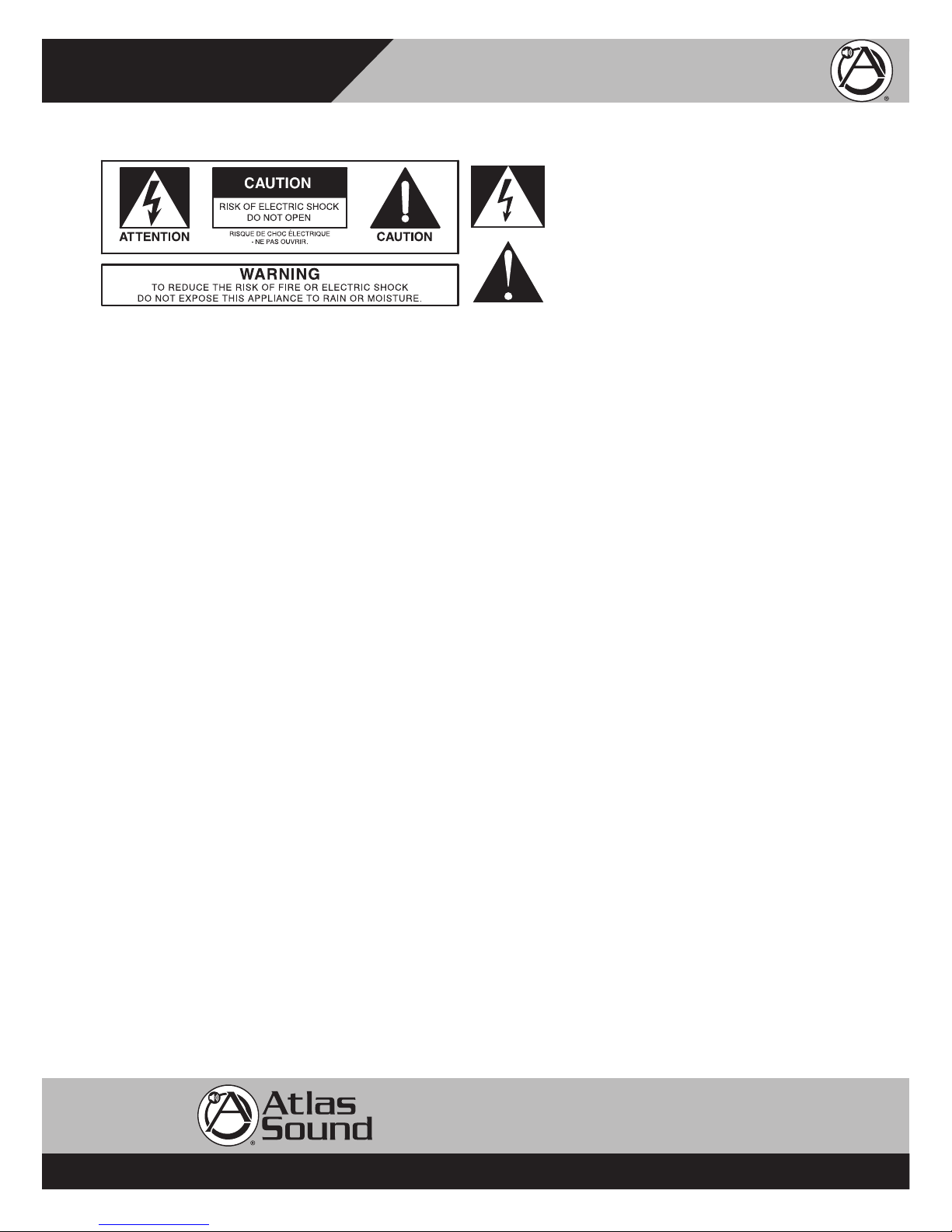 AC outlet and contact Atlas Sound. Do not to attempt to continue operation with the product as this may cause fire or electric shock: