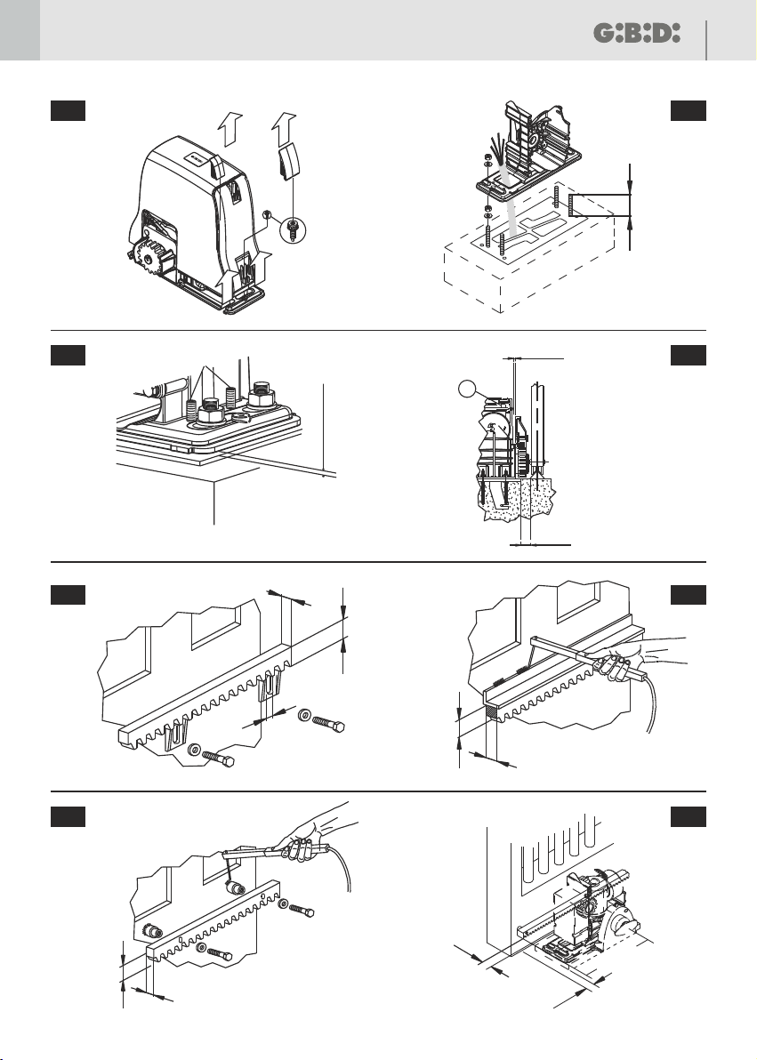 4- appoggiare sul pignone il primo elemento della cremagliera in modo che sporga di 50 mm dal motoriduttore