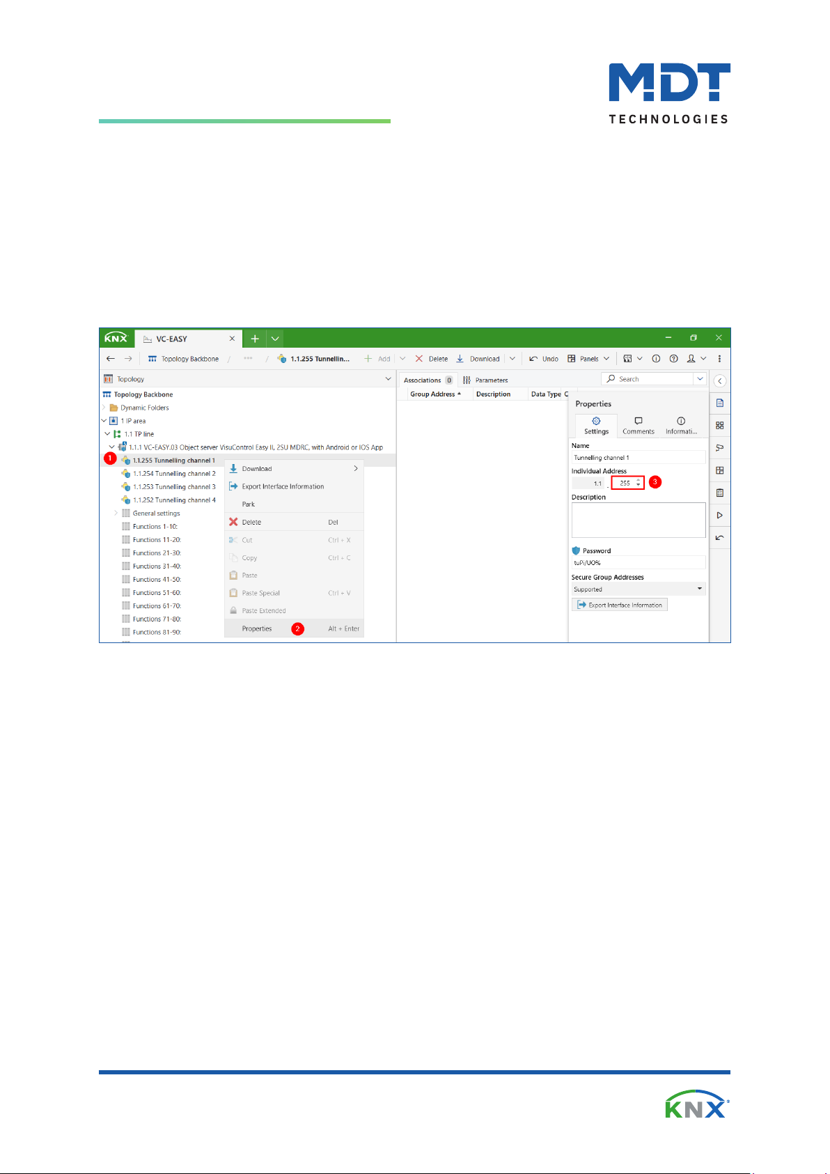 window. Enlarge application program (1), right-click on tunnelling channel -> “Properties” (2),
