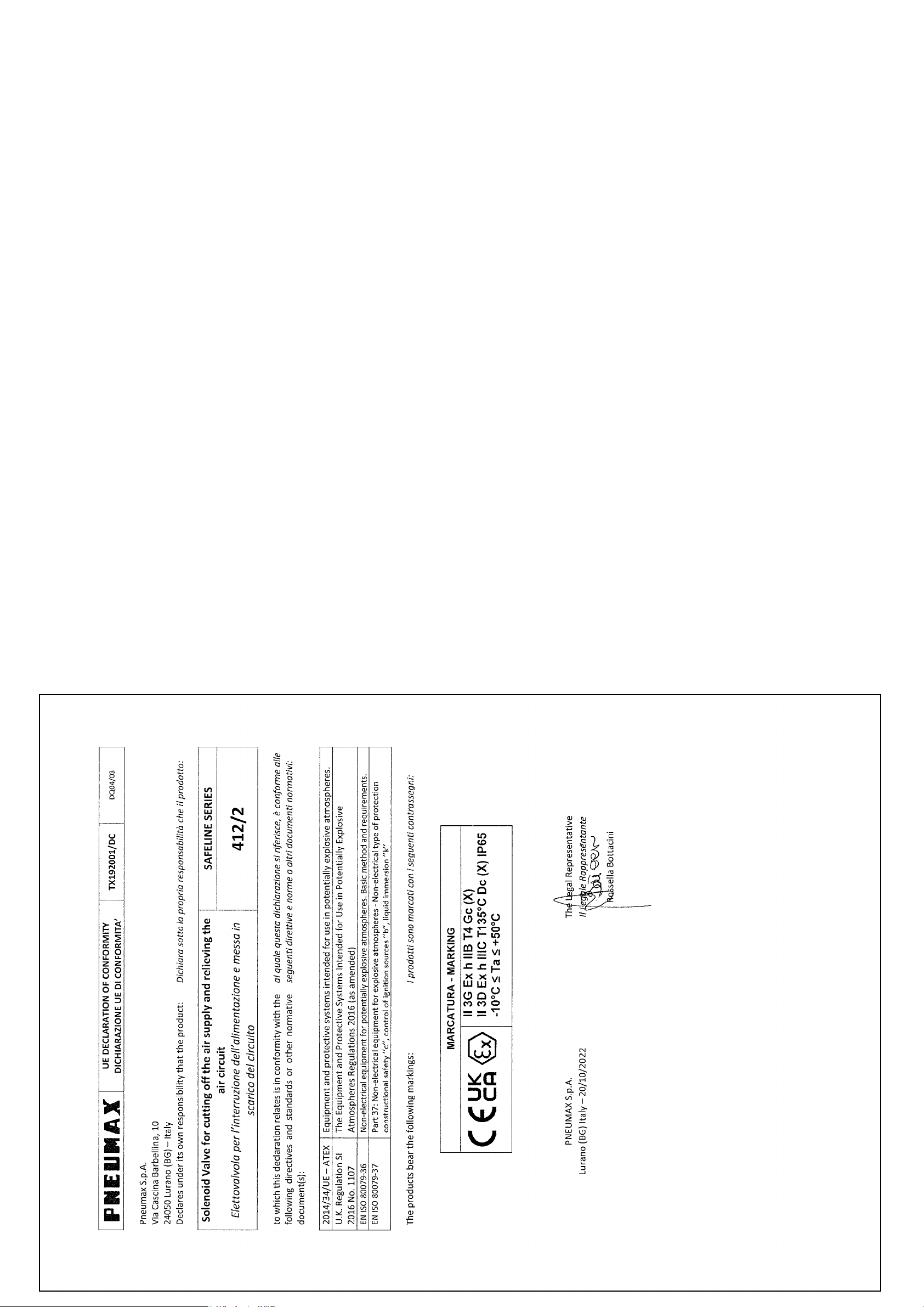 Le valvole serie 412/2 compatta SAFELINE sono state valutate secondo l’allegato II della Direttiva 2014/34/UE – ATEX e secondo le norme EN 80079-