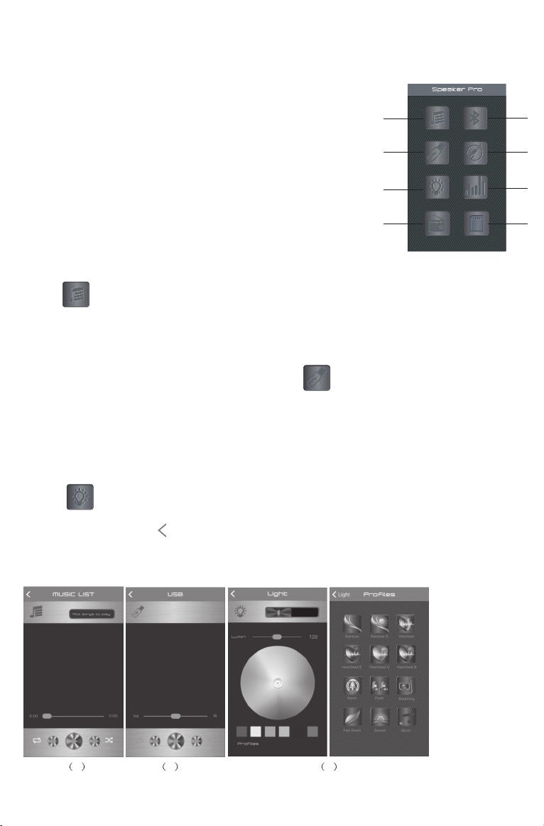 Open the App "Speaker Pro" on your phone, there are 8 function icons on the main
